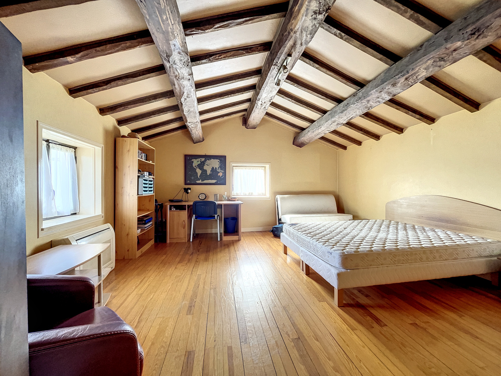 Elle se compose, au rez-de-chaussée, un salon salle à manger avec son poele, une cuisine indépendante, un cellier, 2 chambres, une salle d'eau, et un WC. A l'étage, une mezzanine pouvant faire office de bureau, 3 chambres avec placard, salle de bain et WC. Maison climatisée.