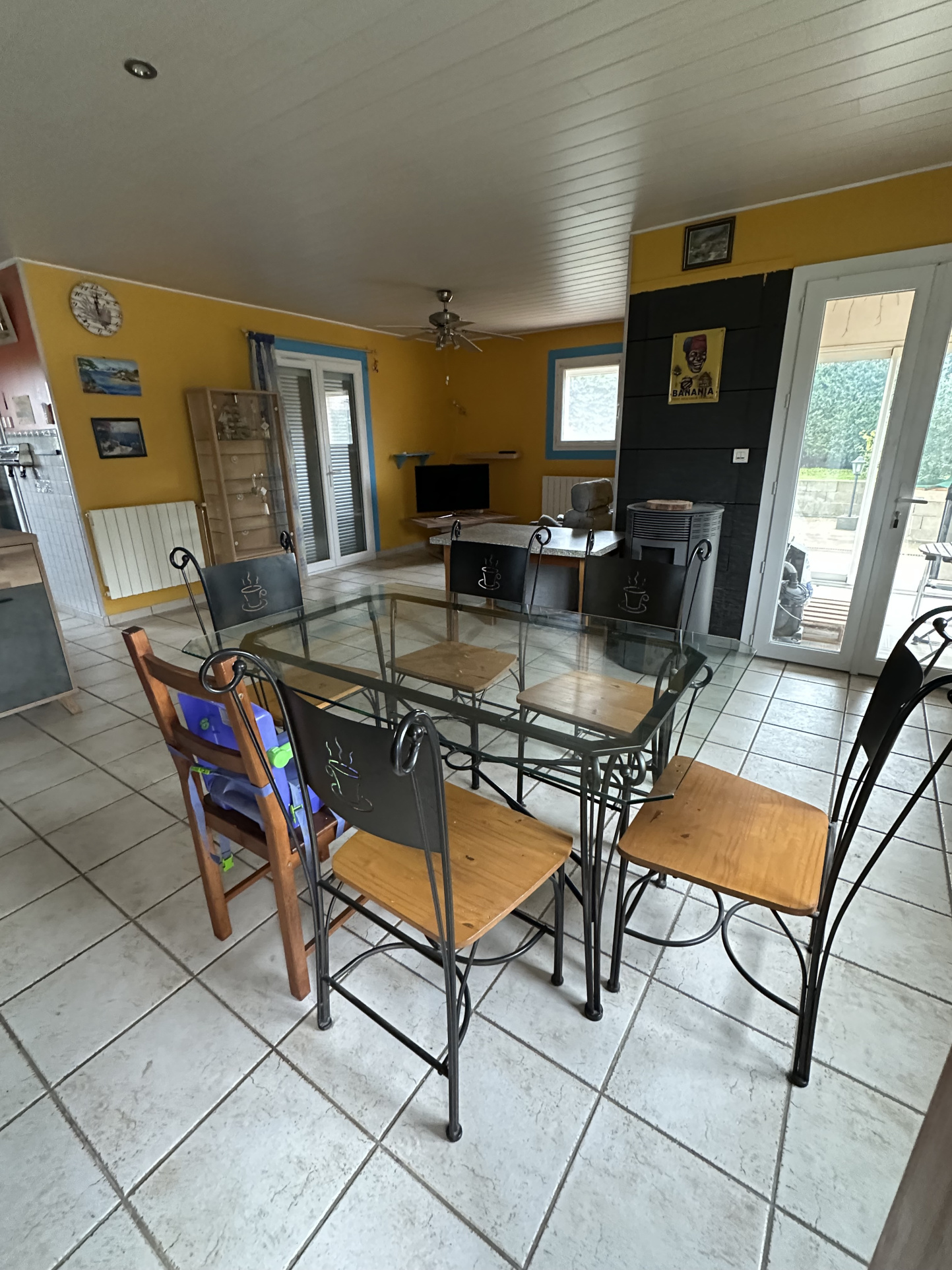 Un poele à granule récent réchauffera la maison, qui comporte une cuisine équipée, un salon, séjour, 3 chambres avec placards intégrés, une salle de douche avec WC, et un garage bien équipé.